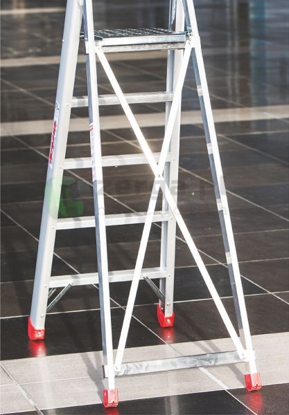 Stopnie 13 cm z pełnego profilu nigdy się nie zdeformują. Podłużnice drabiny wykonane zostały z wytrzymałych, otwartych profili aluminiowych o przekroju 80 x 35 mm. Zastosowano solidne krzyżowe stabilizatory w elemencie tylnym. Platforma robocza z grubej, perforowanej blachy. Aluminiowe podłużnice połączone są ze stopniami za pomocą nitowania (w opatentowanej technologii lotniczej) i dodatkowych wsporników przy pierwszym stopniu. Technologia lotnicza daje gwarancję ponadprzeciętnej trwałości połączenia.