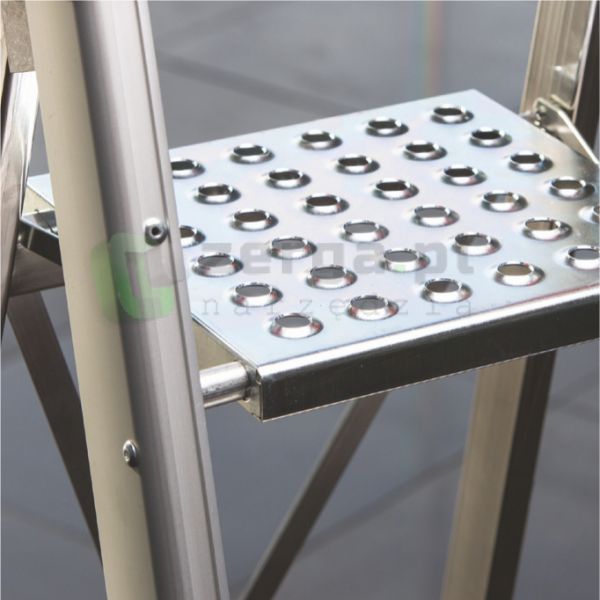 Stopnie 13 cm z pełnego profilu nigdy się nie zdeformują. Podłużnice drabiny wykonane zostały z wytrzymałych, otwartych profili aluminiowych o przekroju 80 x 35 mm. Zastosowano solidne krzyżowe stabilizatory w elemencie tylnym. Platforma robocza z grubej, perforowanej blachy. Aluminiowe podłużnice połączone są ze stopniami za pomocą nitowania (w opatentowanej technologii lotniczej) i dodatkowych wsporników przy pierwszym stopniu. Technologia lotnicza daje gwarancję ponadprzeciętnej trwałości połączenia.